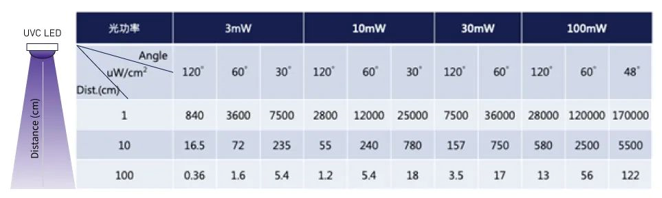 出光角:采用平面透镜封装的灯珠出光角通常在 120º,采用球型透镜封装的出光角在30º~90º可调。其实无论选用多大出光角的 UVC LED,都可以透过设计足量的 LED数量达到需要完全覆盖的杀菌空间。但小出光角可使光线更集中,杀菌时间更短。下表(二)可以看到在相同光功率的条件下,使用更小出光角度的UVC LED可得到更强的UVC辐射强度,越强的UVC (uW/cm2),杀菌时间(Sec)越短。