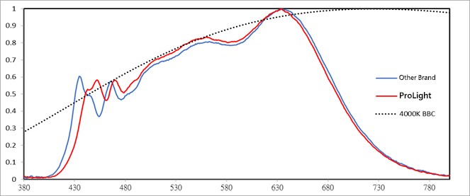 由於自然光的波長,最適合人體自然節律的調整,在充足的自然光照射後,能讓人在光照的日間保持清醒,又助於入夜的睡眠,因此人因照明的設計一直以模擬全光譜的自然光效果為主。此外,LED長久以來為人所排斥的高藍光,也常會讓物品色彩有失真偏藍的現象,但全光譜的連續性波長設計則能滿足所有色彩的真實呈現,避免偏藍的現象。葳天Brill系列,採用藍光晶片及紅綠黃三色螢光粉,研發出最接近自然光譜的模型,搭配CRI 98的全光譜設計,能還原真實的色彩效果。下方的光譜圖,葳天Brill光譜的主曲線(紅色)是沿著4000K的太陽光譜進行,且相較於它牌(藍色曲線)在藍光區間(430-460nm)的波峰值更低,能降低短波藍光的可能性傷害,達到更舒適的照明效果。